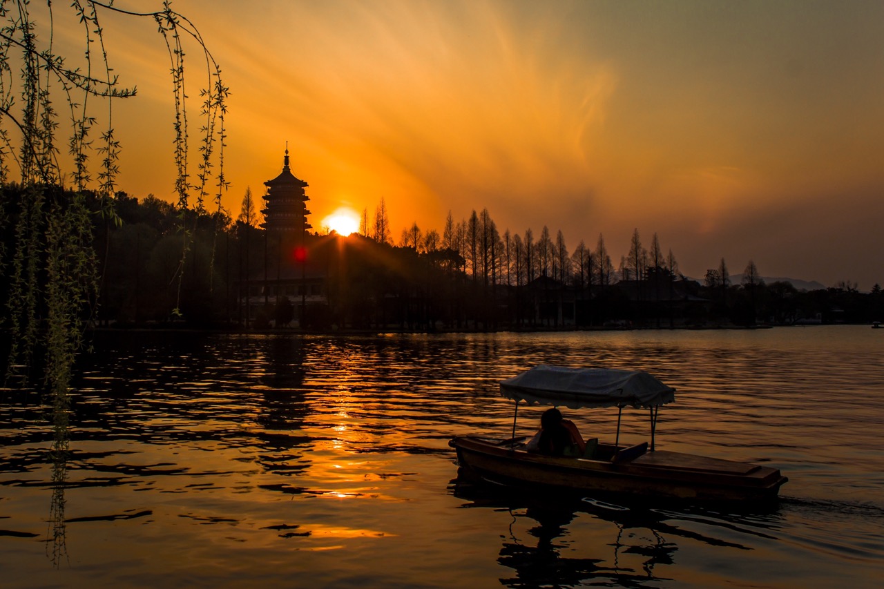 Skip to content Bright mesmerizing sun setting over the West Lake, Hangzhou, China